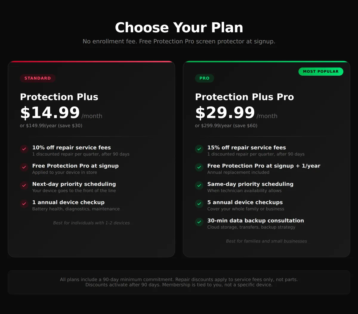 Discounted repairs, priority service, and a free Protection Pro screen protector. Starting at $14.99/month.